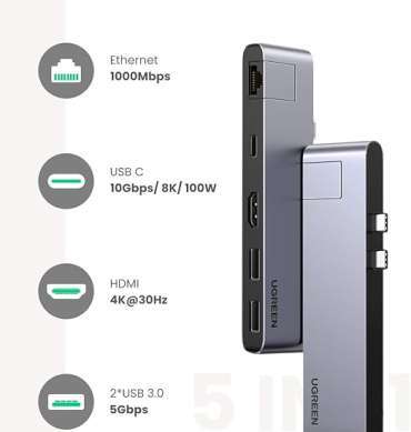 ₨ 10,999.00Original price was: ₨ 10,999.00.₨ 9,499.00Current price is: ₨ 9,499.00.UGREEN 5-in-1 Dual Type-C Hub 4K @30Hz for MacBook