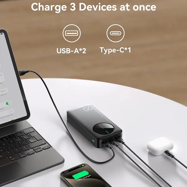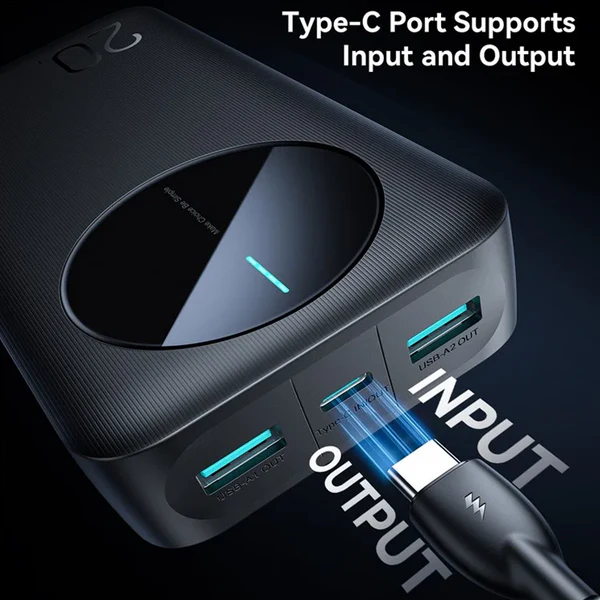 With a massive 20000mAh Lithium Polymer battery, it can charge your smartphone, tablet, or other USB devices multiple times. It features three output ports – two USB-A and one Type-C – allowing you to charge up to three devices simultaneously. The Type-C port is especially versatile, supporting both input and output at 5V/2.4A, making recharging the power bank and your devices faster and more efficient.