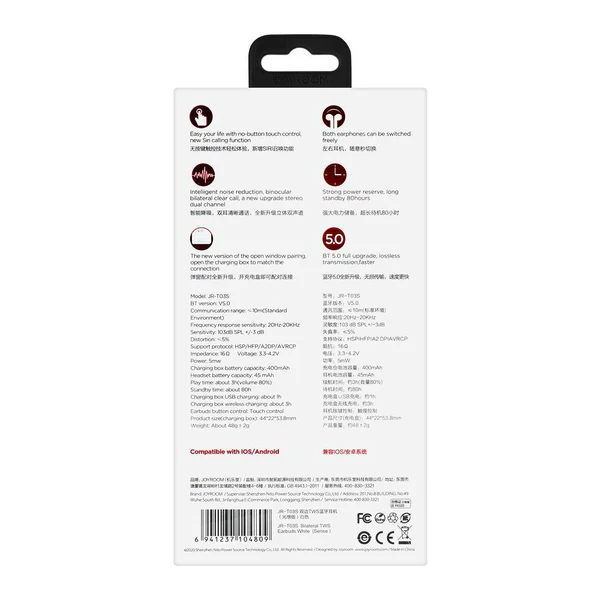 The JR-T03S comes with a smart popup pairing feature. Just open the charging case, and the earbuds automatically pair and connect—no delays, no fuss. The upgraded touch control system lets you manage music, calls, and activate Siri with just a tap. With its 1:1 size design and ergonomic fit, wearing them feels natural and comfortable, even for long hours.
