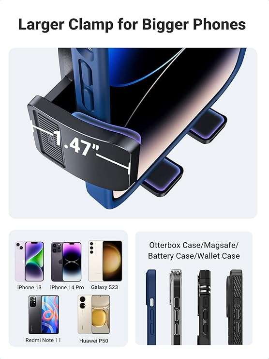 Forget the hassle of removing your phone case every time. The UGREEN vent mount is designed with extended clamp arms that open up to 1.47 inches wide. This allows it to easily fit smartphones with thick cases, wallet cases, or battery cases. It supports phones from 4 to 7 inches, including popular models like the iPhone 14, 13 Pro Mini, 12, 11 Pro, XR, SE, and more.