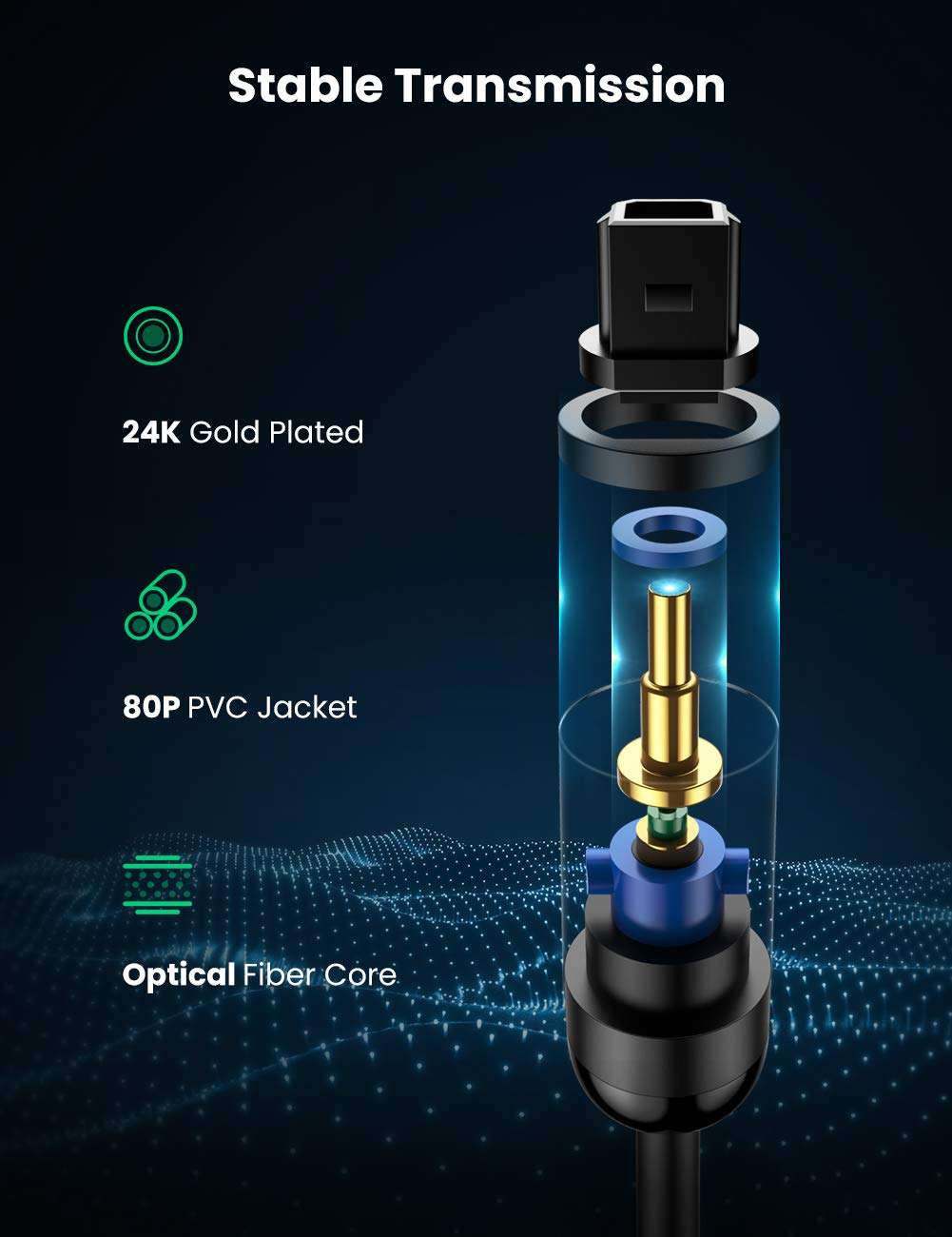 The durable material used in the UGREEN Optical Digital Audio Cable makes it a long-lasting investment. The cable is covered with robust PVC protection, preventing cuts, scratches, and nicks, while the metal casing protects the tiny optical connectors from damage. The removable rubber tips offer extra protection when the cable is not in use, preserving its integrity over time.