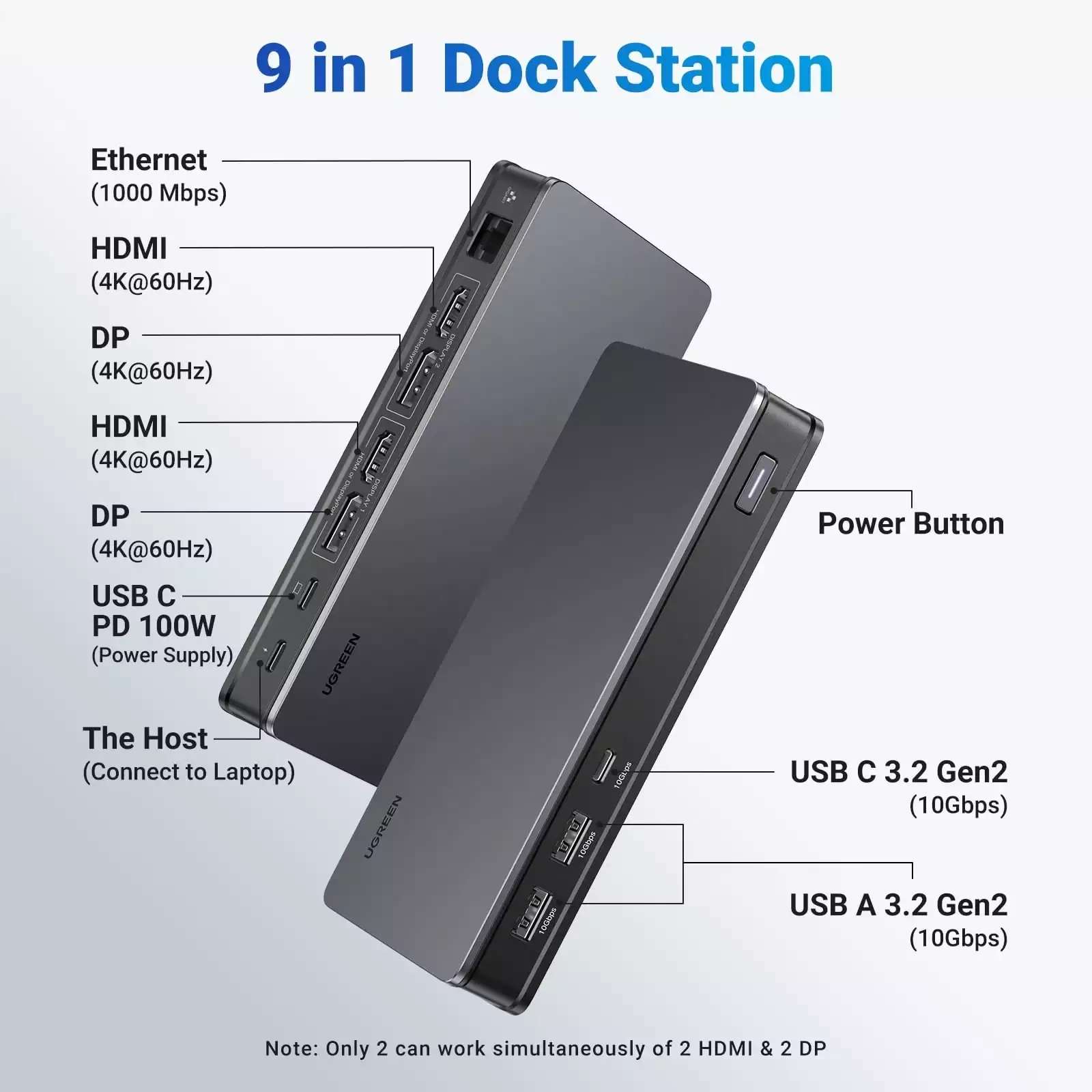 The docking station’s 9-in-1 design includes a variety of ports to suit all your needs. It features 2x HDMI 4K, 2x DP 4K, 1x PD 3.0 100W charging port, 2x USB-A 3.2 (10Gbps), 1x USB-C 3.2 (10Gbps), and 1x Gigabit Ethernet port. This wide range of options makes it an ideal choice for professionals who require seamless connectivity for multiple devices.