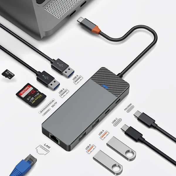 This 9-in-1 multiport adapter transforms a single USB-C input into a variety of essential ports, ensuring seamless data transfer, fast charging, and high-definition video output. Equipped with two USB 3.0 and two USB 2.0 ports, this adapter allows you to connect multiple peripherals, such as keyboards, mice, flash drives, and external hard drives, with impressive speed and reliability.